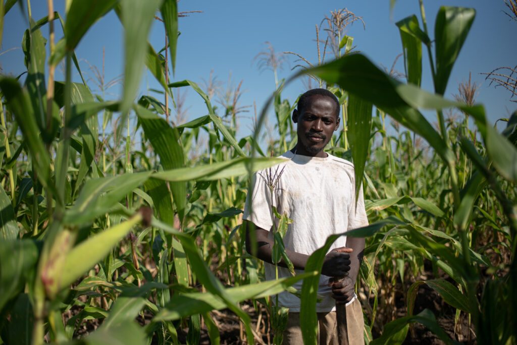 En bit bort från floden, på ett fält med rader av majs och sockerrör, står Mouzino Nito Jose böjd över jorden. Han är också en av WWFs lokala länkar och driver dessutom ett småskaligt jordbruk tillsammans med sin fru.