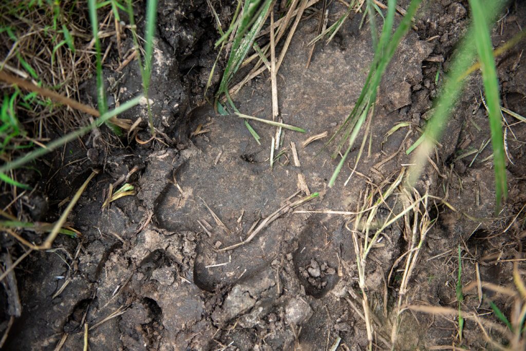 När vi går längs den smala stigen ner mot floden ser vi ett stort hål i buskaget. I den fuktiga leran syns färska fotspår – en flodhäst har nyligen passerat här.