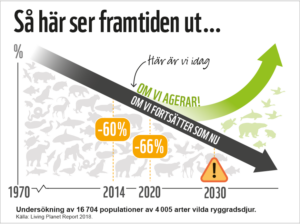 Om vi fortsätter i samma takt riskerar vi att mängden vilda ryggradsdjur minskar med två tredjedelar redan till 2020*, jämfört med 1970. Redan nu har populationerna i snitt minskat med mer än hälften. Vi har inte varit med om det här tidigare och ingen vet exakt hur ekosystemen påverkas – bara att de gör det. Vi vet också att vi människor är helt beroende av friska ekosystem för vår överlevnad.